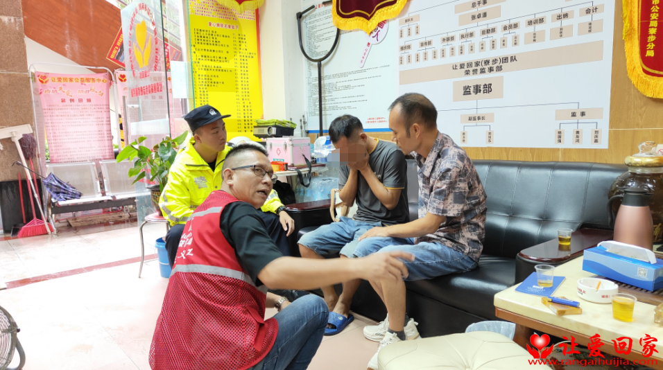 在了解事情经过后,在寮步公安大数据的全力支持下。寮步派出所警员封锦雄同志,大致按照年龄和二标变动轨迹逐步缩小人员范围,之后通过带领志愿者、义警走访摸排,把疑似人员逐一排查。终于确定了龙某的身份和目前住所。9月8日上午,指挥中心袁建锋同志和寮步义警“让爱回家”志愿者服务队赖玉强及工作人员,借帮其补办身份证找工作之机将其带到公益中心办公室与家人团聚。相见现场,离散十多年的兄弟俩拥而泣,互诉衷肠,情深处龙某泪流满面悔不当初啊。在现场警官,志愿者及家人的劝导,开解下,龙某终于打开心结,高高兴兴地收拾行李与哥哥踏上了返乡的旅程。回归社会,回归家庭。