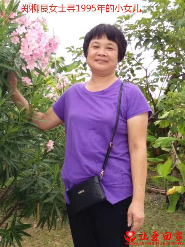 | 其他说明 | 郑柳艮女士:住广东省东莞市虎门镇白沙社区 郑女士刚生下孩子不久时,因家庭原因实属无奈把刚生下的孩子送给别人,当时有两位老人早已留意了一户好人家,生下来十几天之后就把孩子送走了,孩子抱走时身上有一张红纸写了孩子的出生日期1995年1月8日出生,当时用红色被子和一条粉色毛巾裹着,现在相隔了26年了,郑女士一直挂念孩子,想与孩子见一面,看看孩子如今过得如何,如有消息请联系15913778992 |
